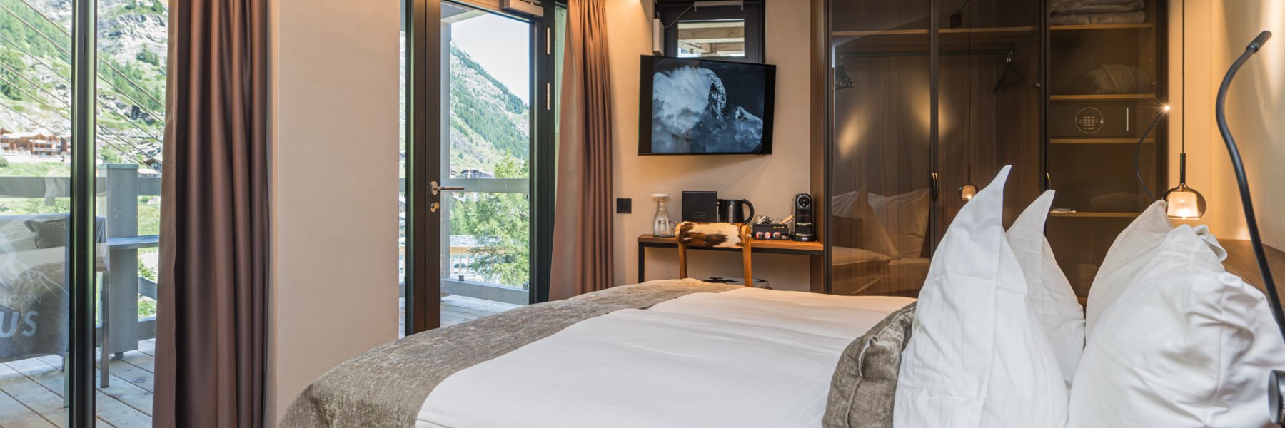 Geniessen Sie Ihren Aufenthalt in einem hellen Superior-Doppelzimmer mit ca. 25 m2. Vom Balkon oder der Terrasse aus sehen Sie die malerische Walliser Landschaft mit Blick Richtung Dom und Dorf Zermatt. (Belegung max. 4 Personen.)
