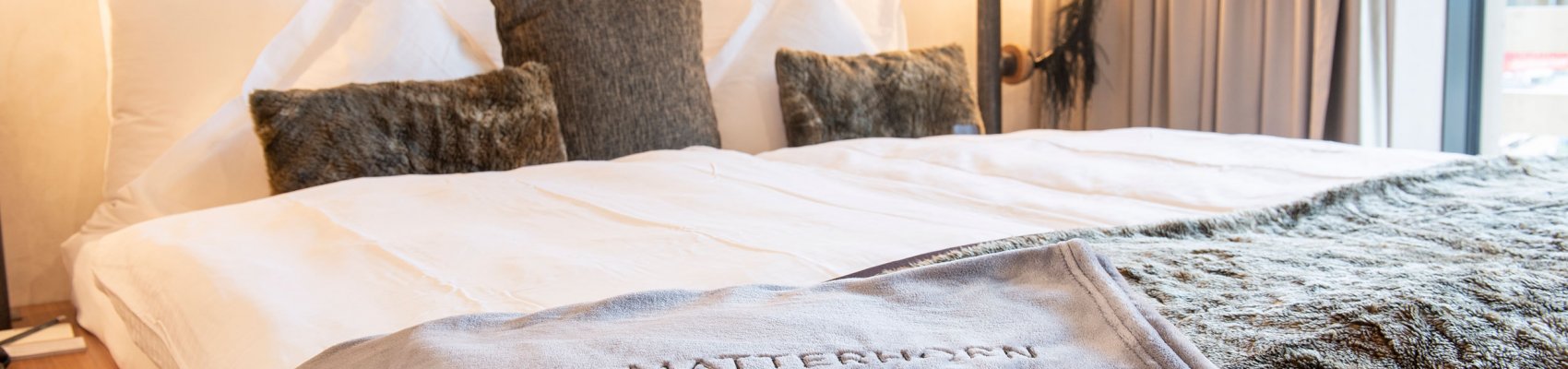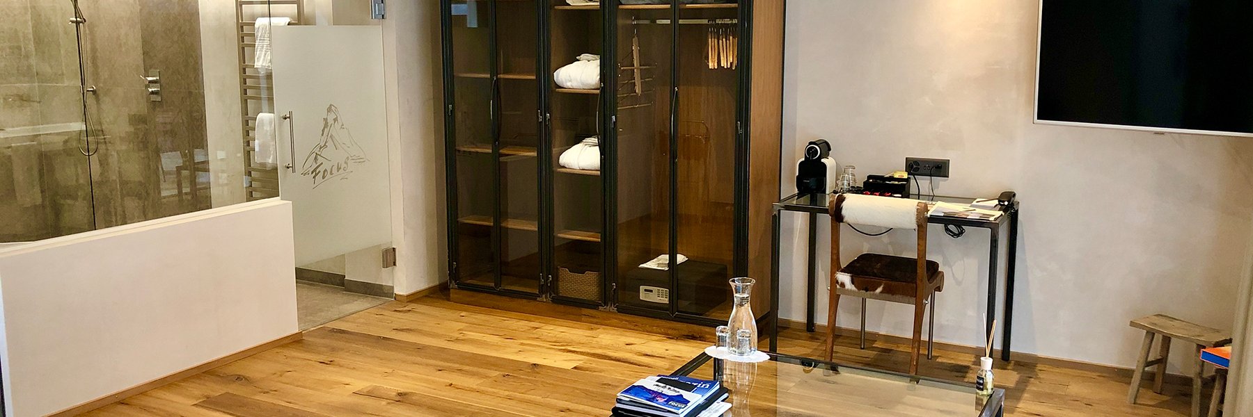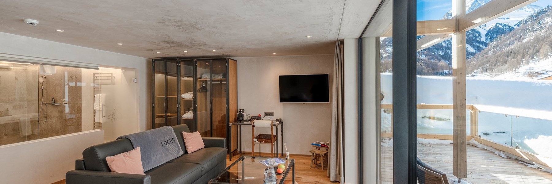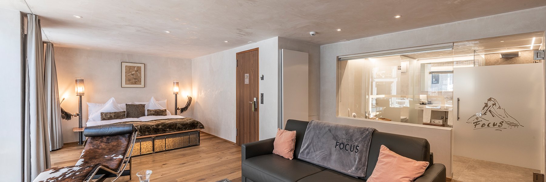 The Junior Suite impresses with its spacious rooms and terrace with side view to the famous Matterhorn. The bedroom with stylishly illuminated bedstead is open to the cosy living room. The spacious bathroom with freestanding bathtub and rain shower invites you to relax. (Occupancy max. 4 persons)