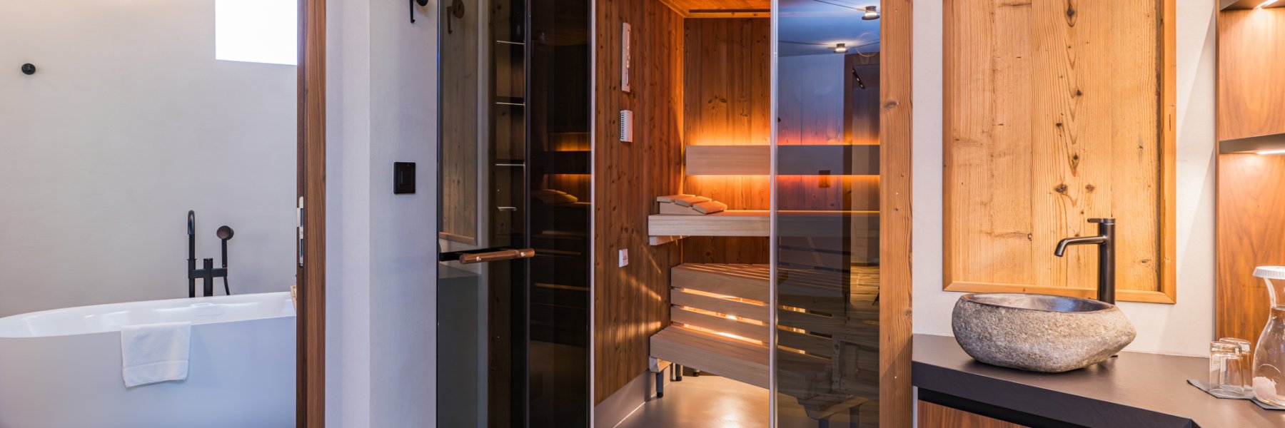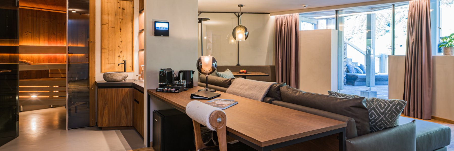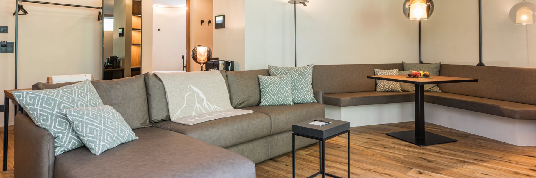 The highlight of the new 75m2 two-room suite? The private wellness area with outdoor jacuzzi and views of the Matterhorn! The SPA suite also has its own Sanarium® and a bathroom with raindance shower and free-standing bathtub. In addition to the living room with sofa bed, sitting area and separate bedroom, there is also a large terrace with a view of the Zermatt mountains. (Occupancy max. 4 persons)