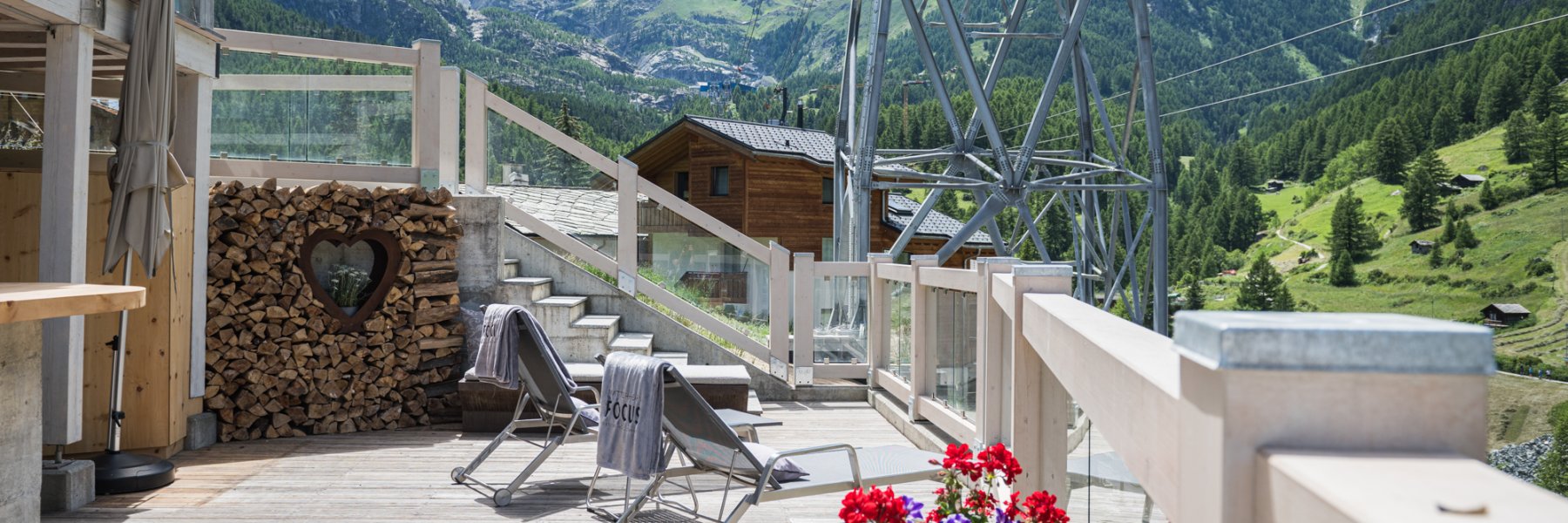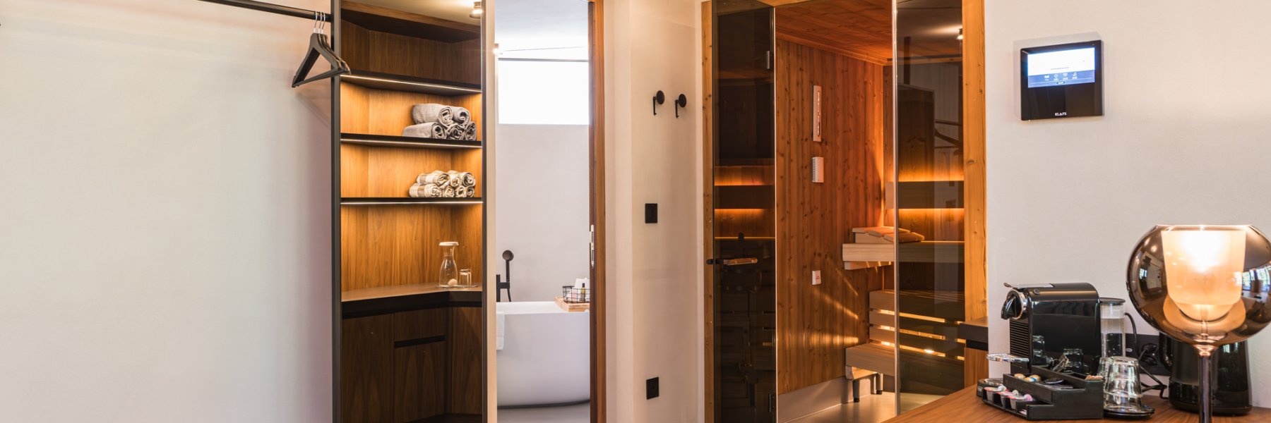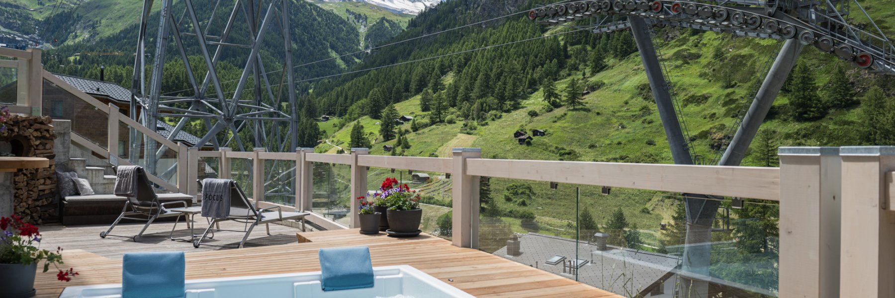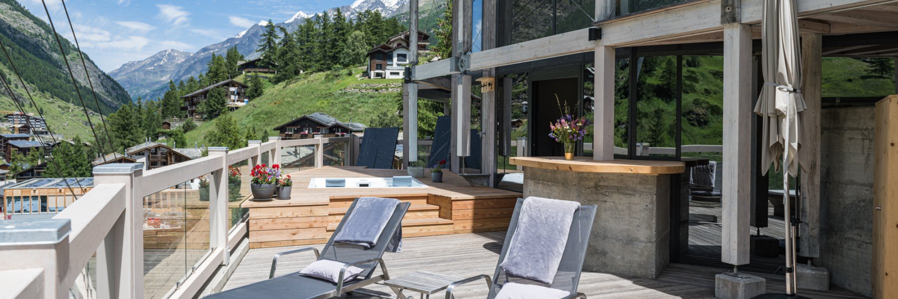The highlight of the new 75m2 two-room suite? The private wellness area with outdoor jacuzzi and views of the Matterhorn! The SPA suite also has its own Sanarium® and a bathroom with raindance shower and free-standing bathtub. In addition to the living room with sofa bed, sitting area and separate bedroom, there is also a large terrace with a view of the Zermatt mountains. (Occupancy max. 4 persons)